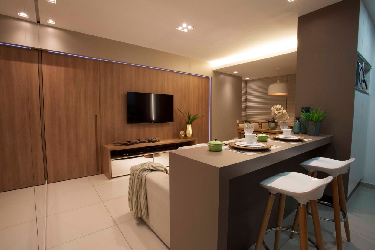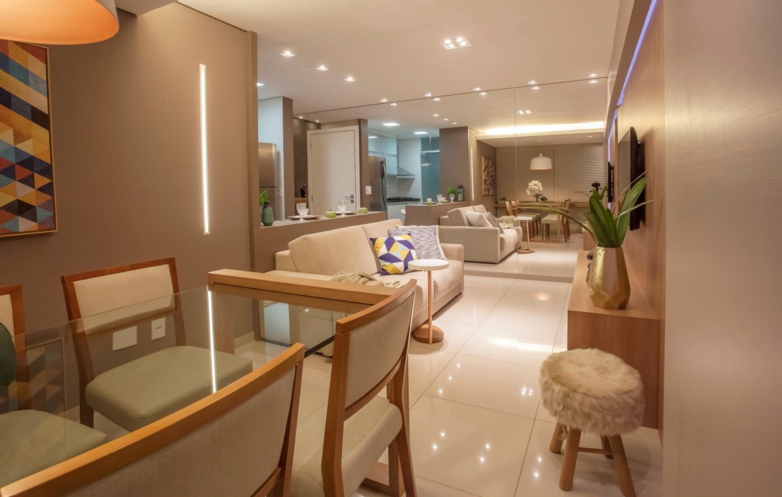 As profissionais Bárbara Velloso Martins Botelho e Daniela Ferreira Friche estão à frente do escritório Botelho e Friche Arquitetura. Dentre os diversos tipos de projeto que elas devolvem, o projeto da área social de apartamento no Vila da Serra é um destaque residencial. A intenção principal deste trabalho foi transformar o longo espaço retangular destinado somente à sala de estar em dois ambientes, o estar e o jantar, de forma que ficassem bem marcados e independentes.