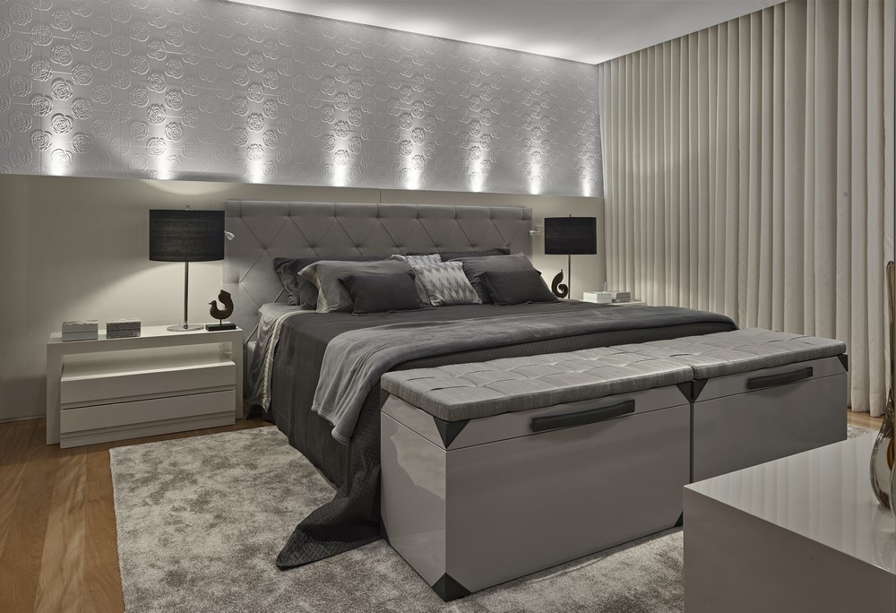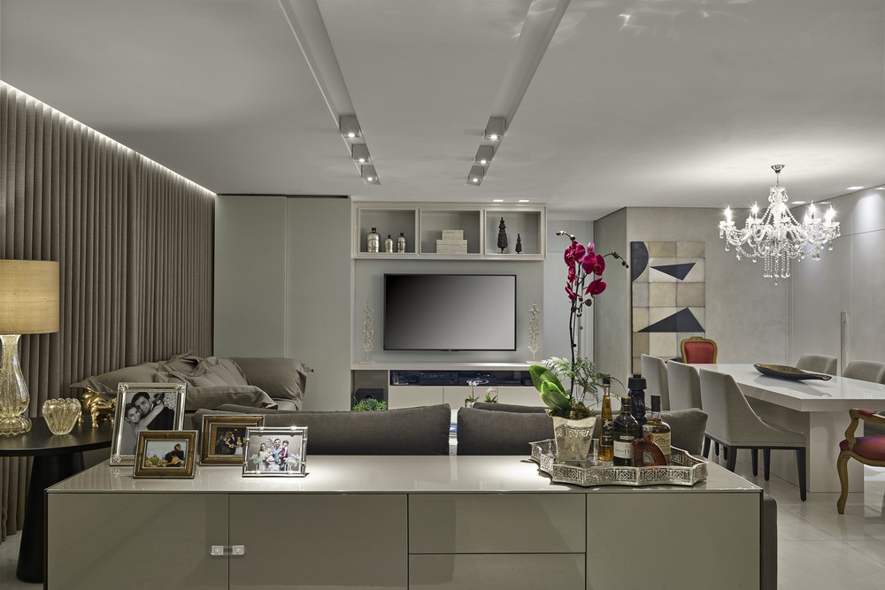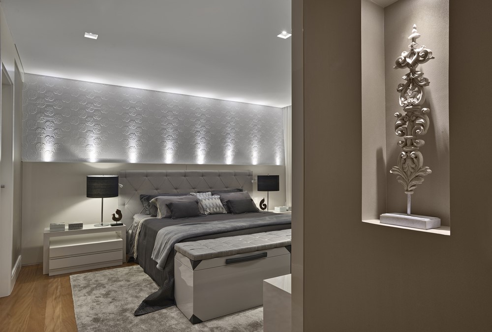 A família queria cores neutras e clima intimista neste apartamento elegante. A arquiteta optou por criar cenas e realçar texturas através da iluminação da Templuz lançando mão de arandelas, trilhos, spots embutidos, abajures e efeitos, como o wall washing na suíte do casal.