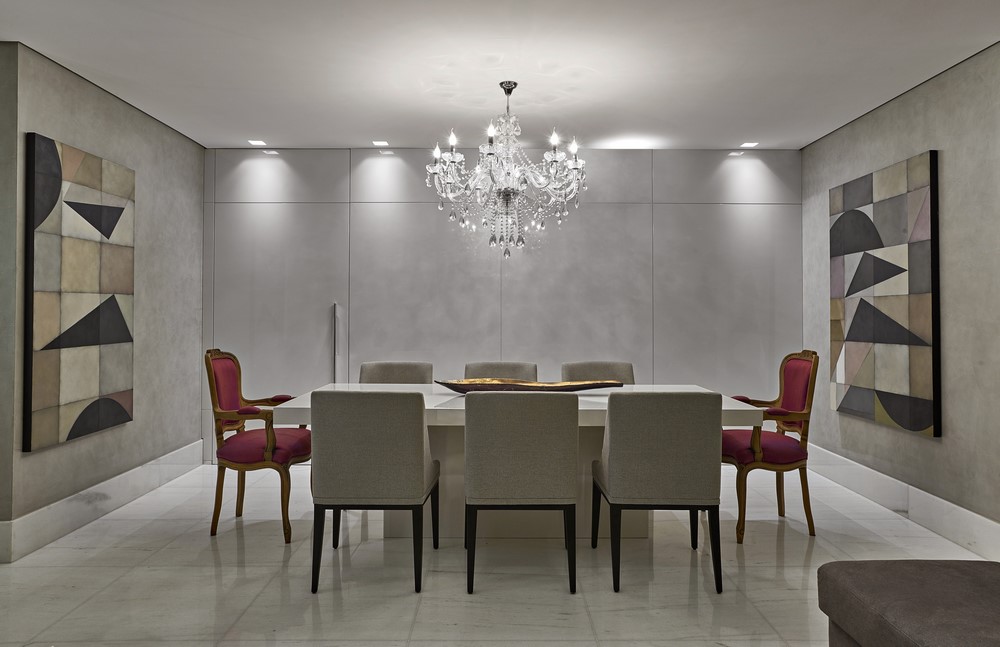 De estilo mais romântico, a esposa pediu que o projeto partisse de um lustre de cristal e duas cadeiras que foram usados na sala de jantar. Já o marido, pragmático, focou no melhor custo-benefício. A mistura deu certo.