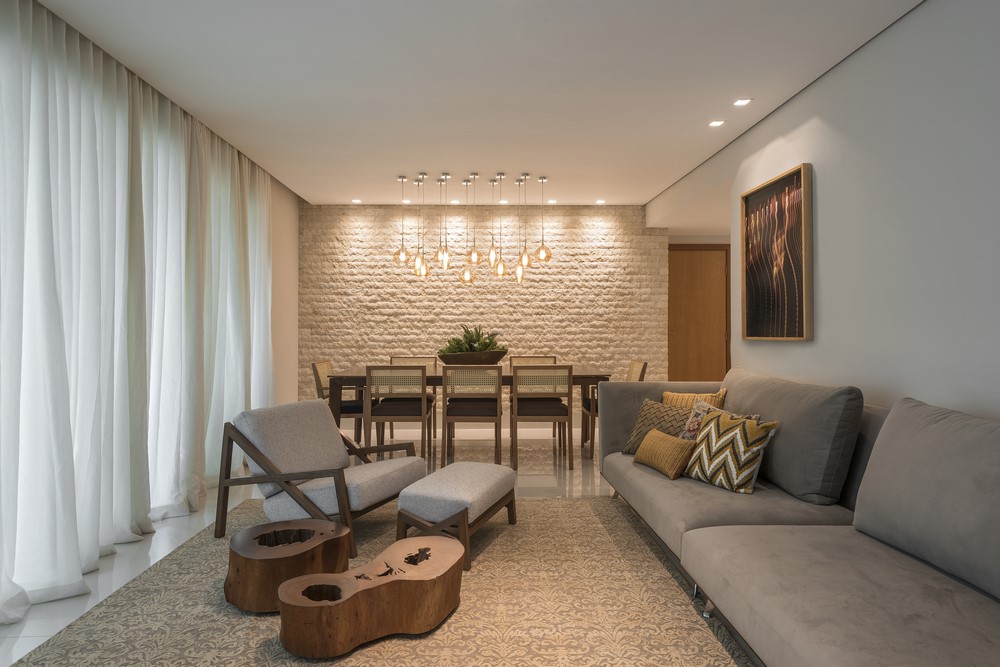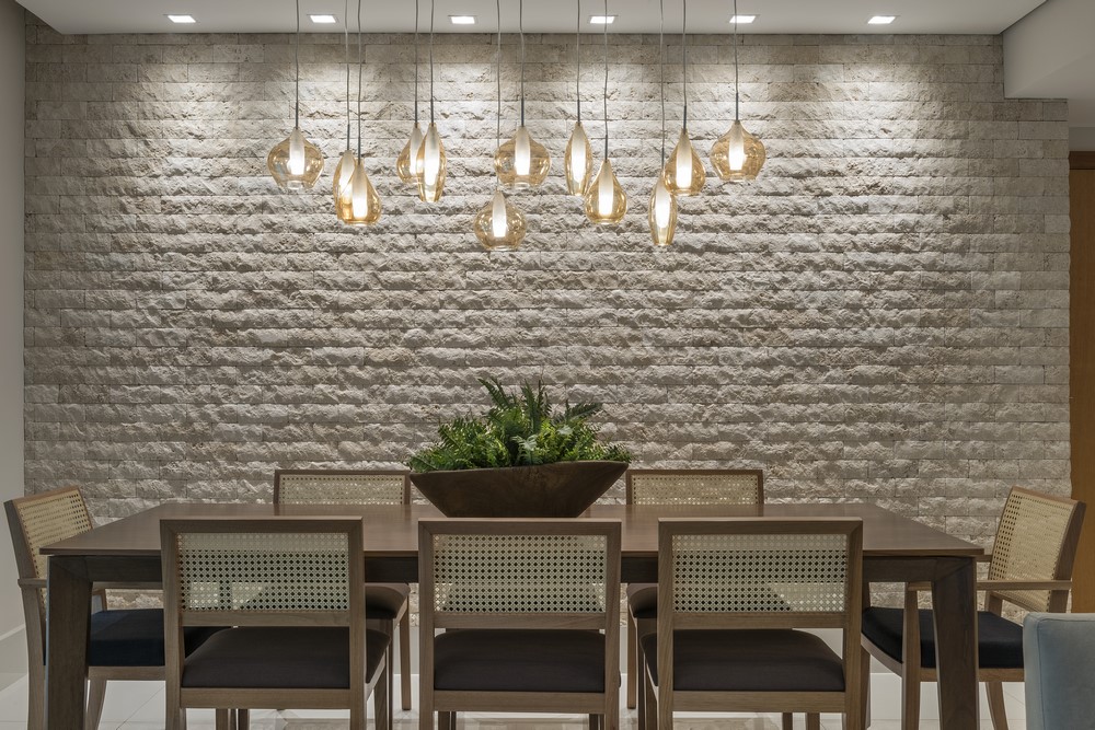 No living divido em três ambientes (sala, conversação e jantar) é possível ver o cuidado da profissional com cada detalhe do projeto. No jantar, a mesa em nogueira para oito lugares ganhou cadeiras em palhinha e o destaque do ambiente vai para a parede ao fundo com revestimento de mármore travertino em forma de tijolinhos que faz contraste com o moderno conjunto de pendentes da Templuz.