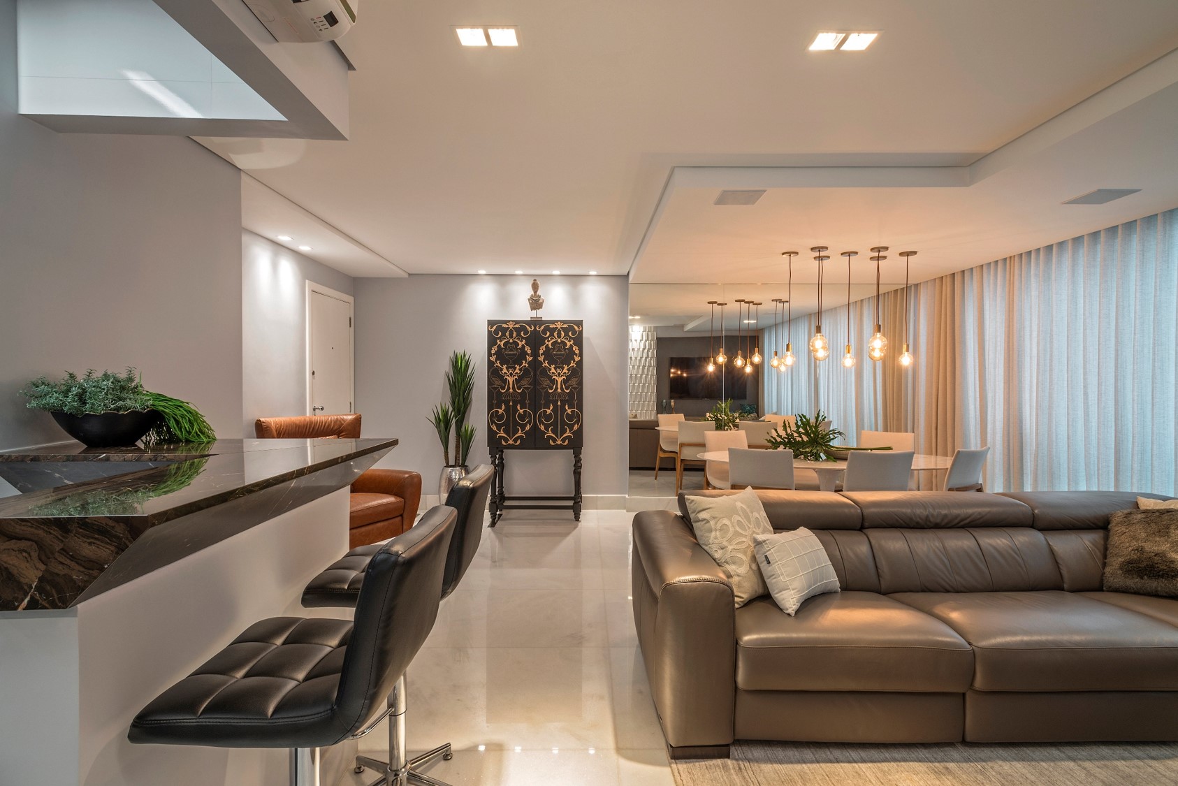 A decoração desse apartamento foi desenvolvida pelo escritório LM Designers, que seguiu um conceito contemporâneo com toques asiáticos. O intuito foi projetar um espaço com linhas modernas e prático,sem muitos excessos, e que ao mesmo tempo traduzisse a personalidade dos clientes. Por isso, a paleta de cores trabalhada foi em tons neutros e os elementos de destaque do ambiente se materializam nos móveis de personalidade.