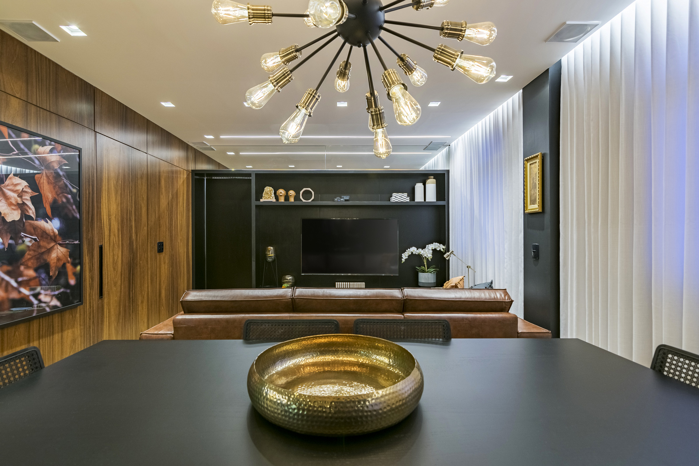 O ponto central do jantar é o pendente Sputinik, uma escolha que evoca o estilo vintage, dando chame à decoração. Essa luminária pode ser composta com diversas lâmpadas, sendo a mais recomendada o modelo "sino" em led dimerizável, da marca Phillips. O modelo é indispensável para sua composição, pois permite controlar a intensidade da luz.