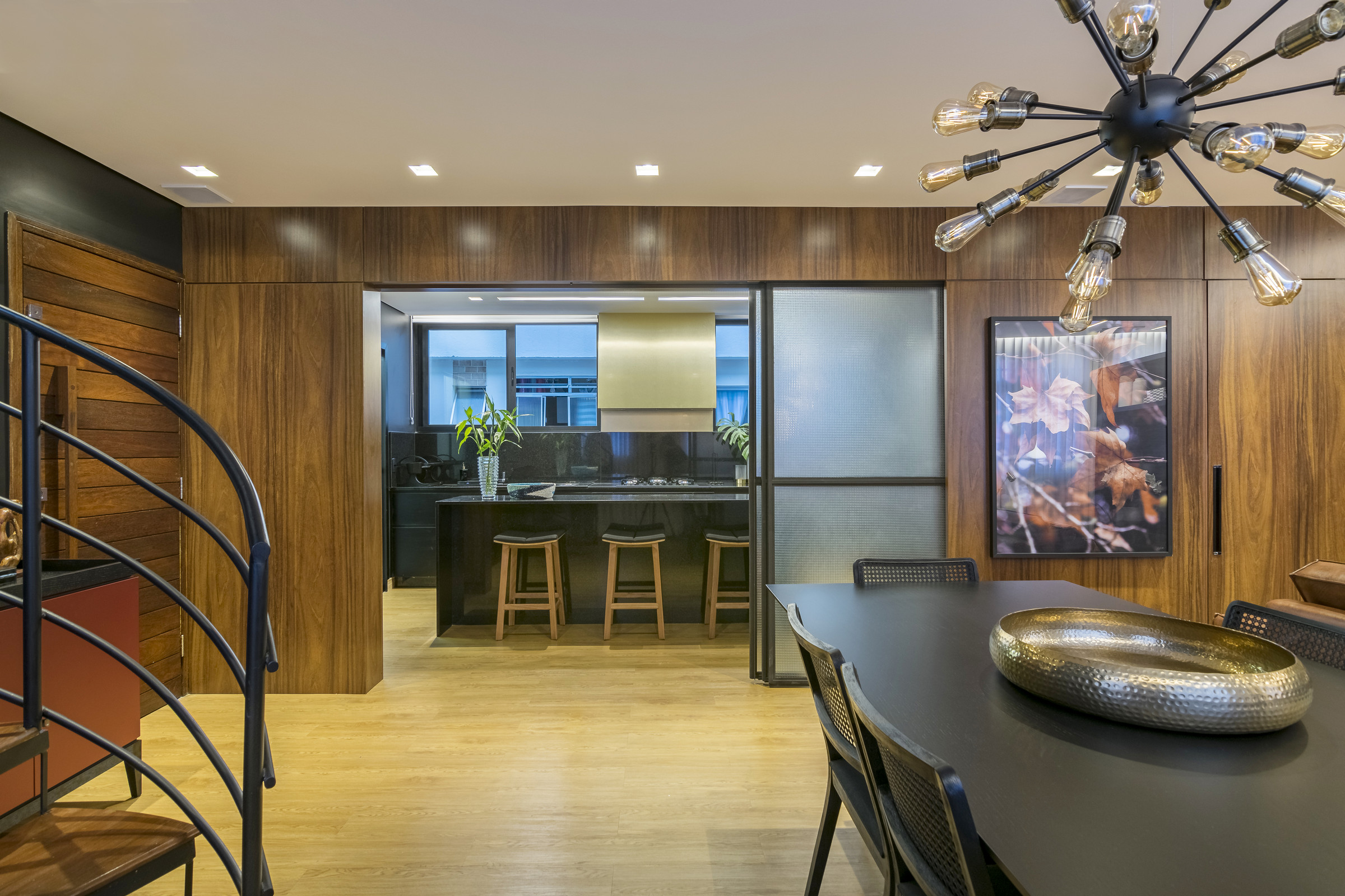 O apartamento passou por uma transformação completa: criou-se uma maior integração dos espaços, em estilo loft, no primeiro andar; e no segundo, houve ampliação de cômodos para atender ao novo espaço gourmet.