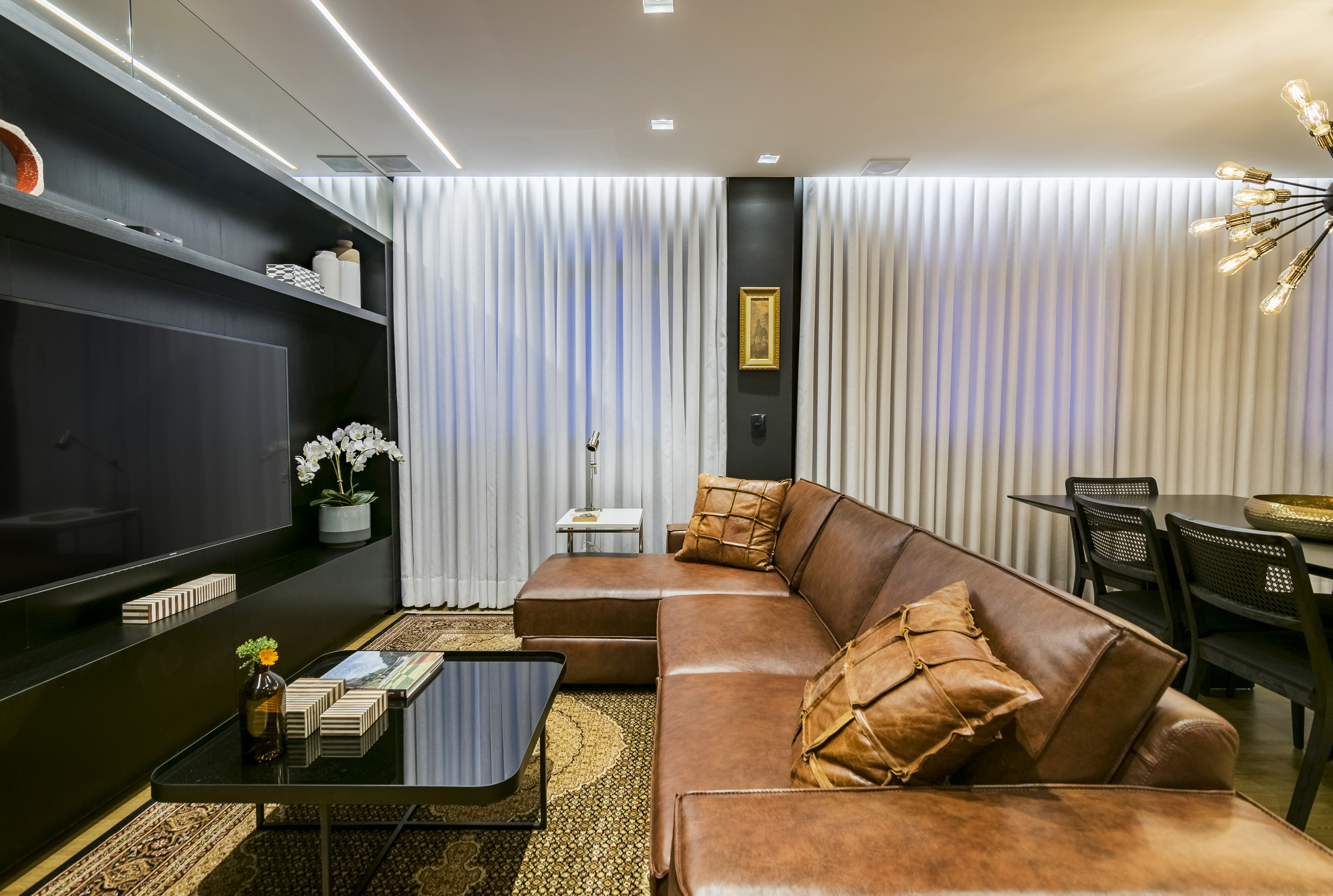O projeto de reforma desse apartamento foi estudado para atender aos desejos de um jovem casal sem filhos. O profissional Sandro De Bernardi, do escritório De Bernardi Arquitetura, trabalhou para desenvolver uma proposta em estilo moderno, marcado pelas linhas retas. Segundo o arquiteto, "o projeto de interiores não teve receio em utilizar o preto como cor predominante, mas fazendo uso da madeira, do couro e de uma boa iluminação para aquecer os espaços".