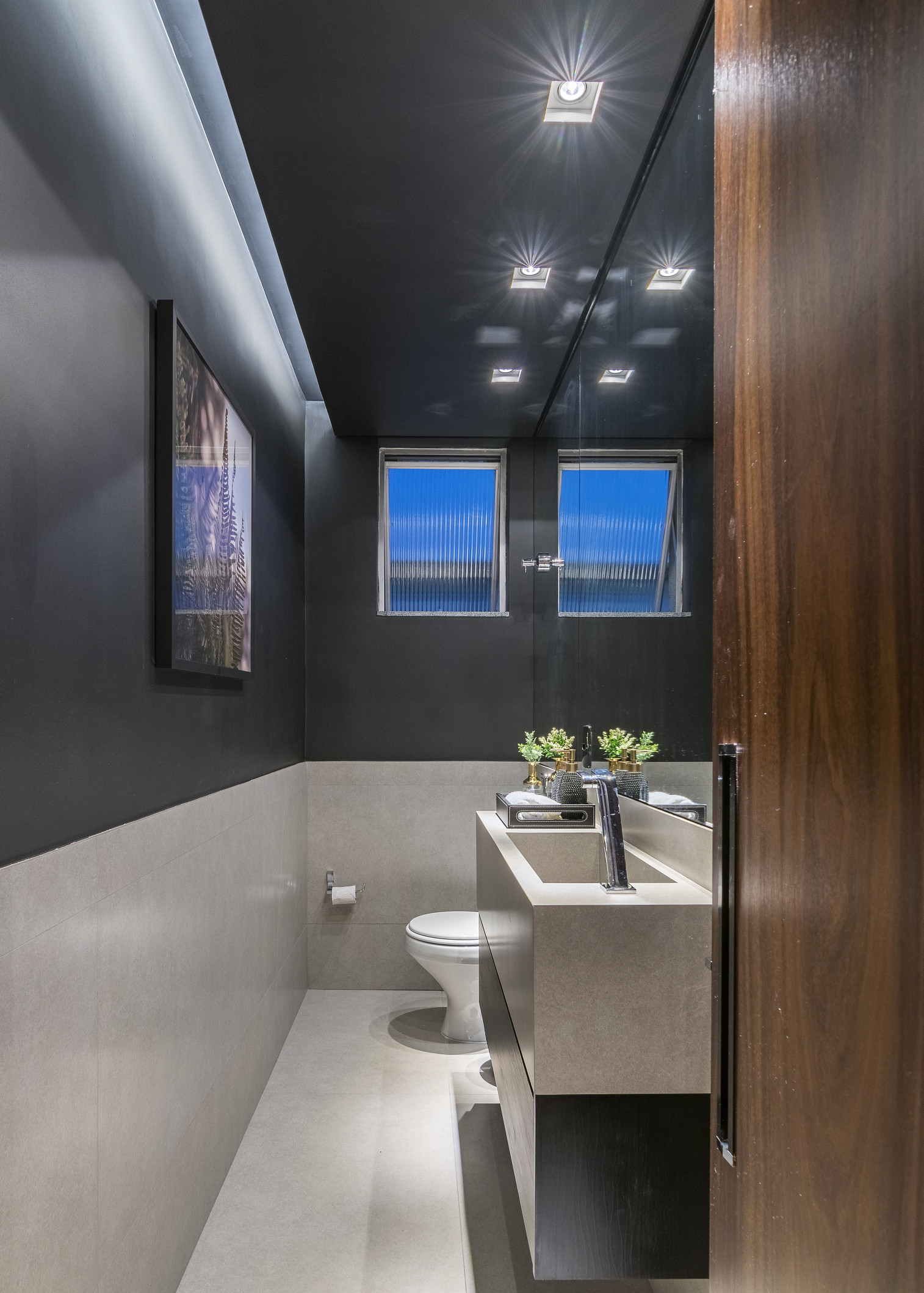 O lavabo seguiu o mesmo estilo de decoração dos demais espaços e, mesmo usando um tom escuro de forma predominante, o espaço ficou bem iluminado devido ao uso dos spots sem borda, com luz focal sobre a pia, que trouxe uma luz cênica para o espaço. A sanca de luz invertida completou o pequeno ambiente com um destaque decorativo e com muito estilo.